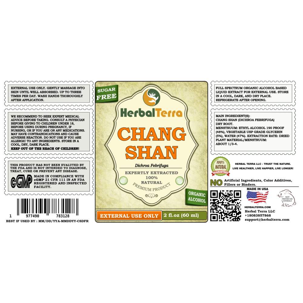 Main Ingredients: Main ingredient: Chang Shan (Dichroa Febrifuga) Dry root. Origin of plant material: Thailand. Menstruum: Ethanol, vegetable palm glycerin, crystal clear water. Contains NO: GMO, gluten, artificial colors, heavy metals, preservatives, pesticides, fertilizers.