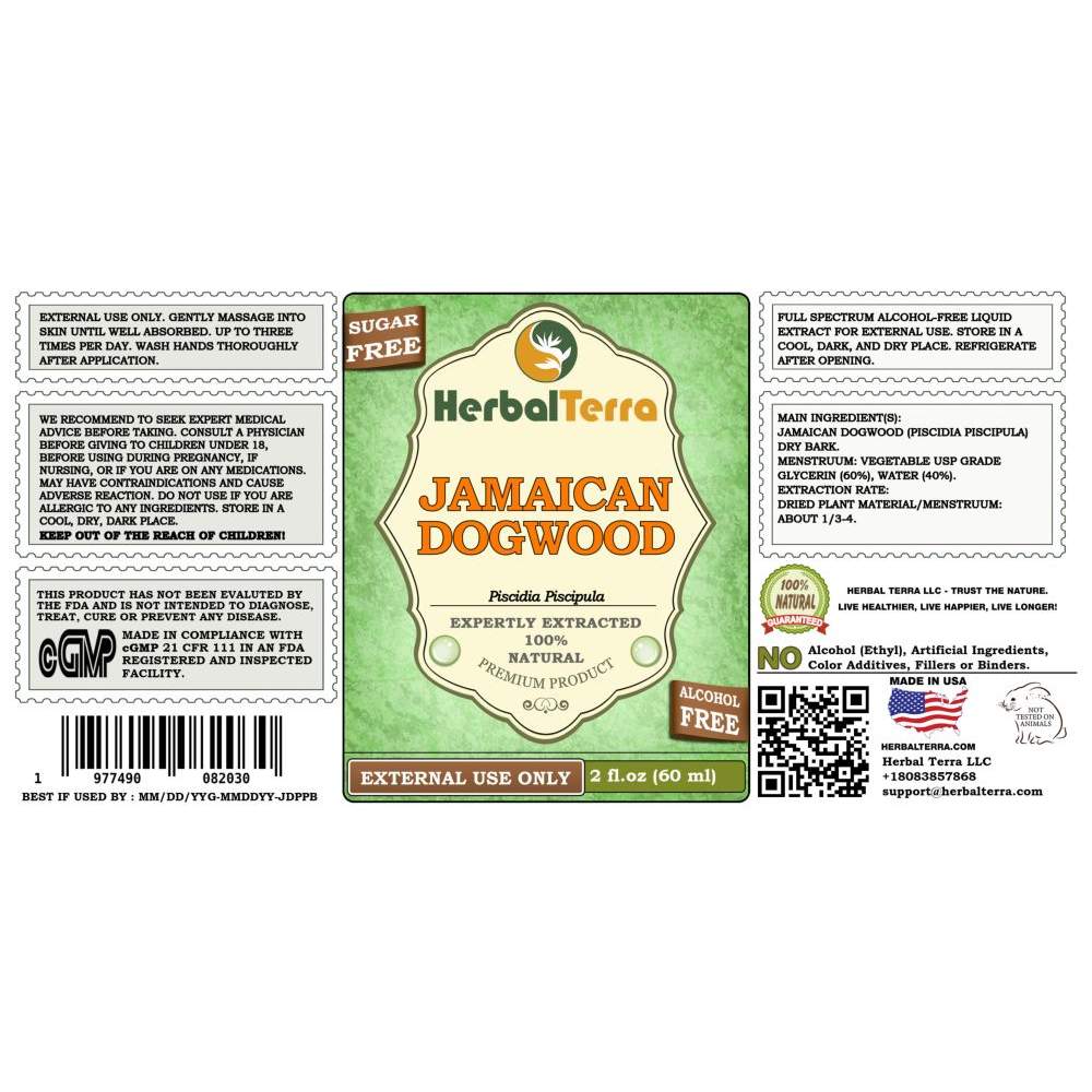 Main Ingredients: Main ingredient: Wild Harvested Jamaican Dogwood (Piscidia Piscipula) Dry Bark. Origin of plant material: Jamaica. Menstruum: Ethanol, vegetable palm glycerin, crystal clear water. Contains NO: GMO, gluten, artificial colors, heavy metals, preservatives, pesticides, fertilizers.